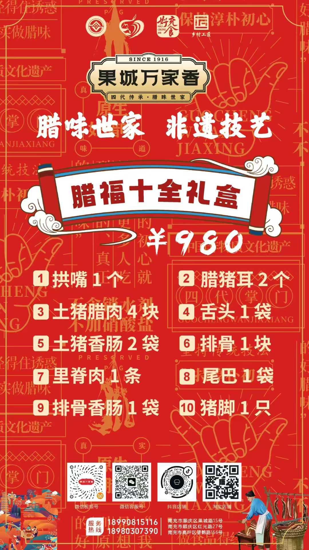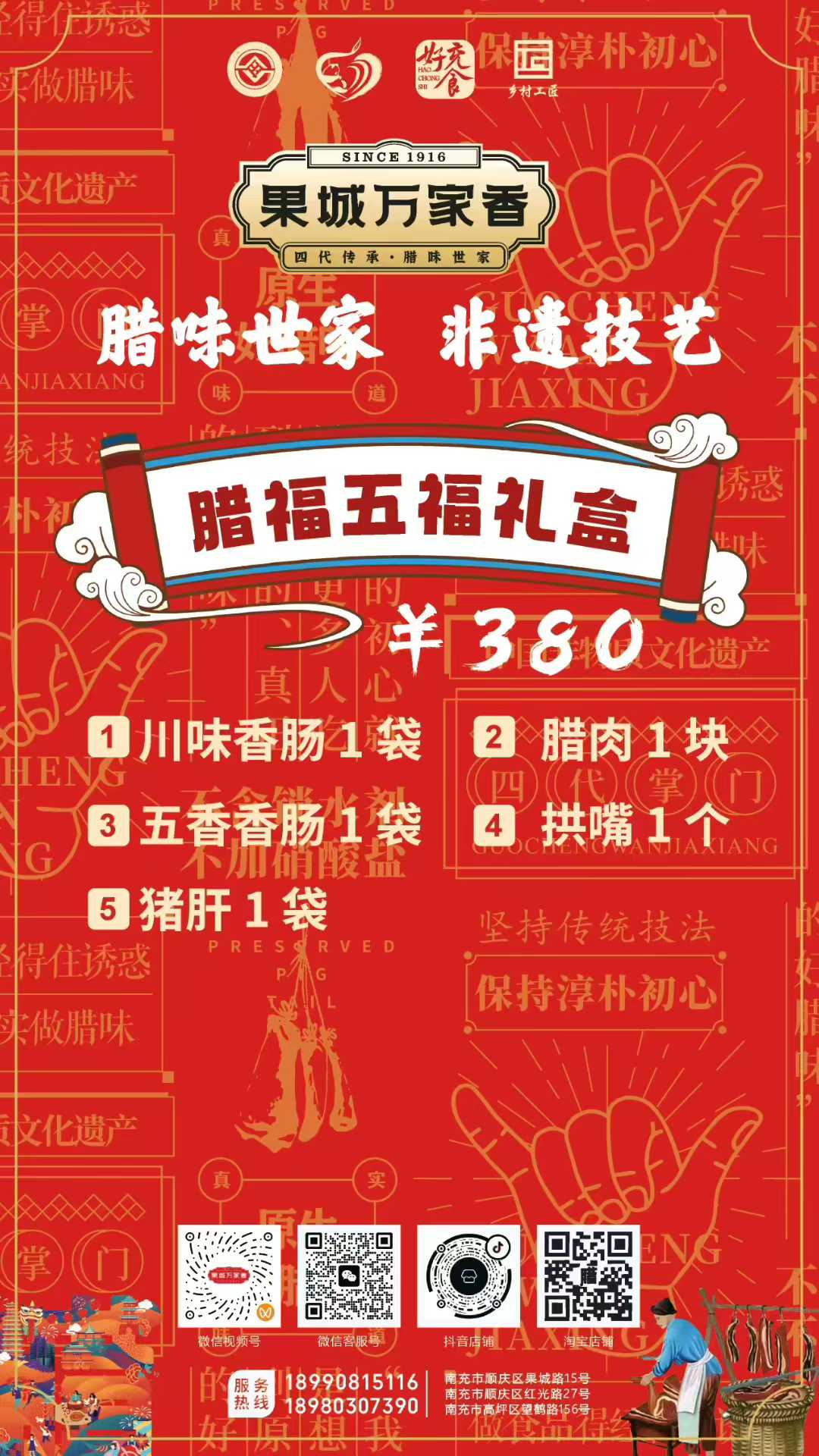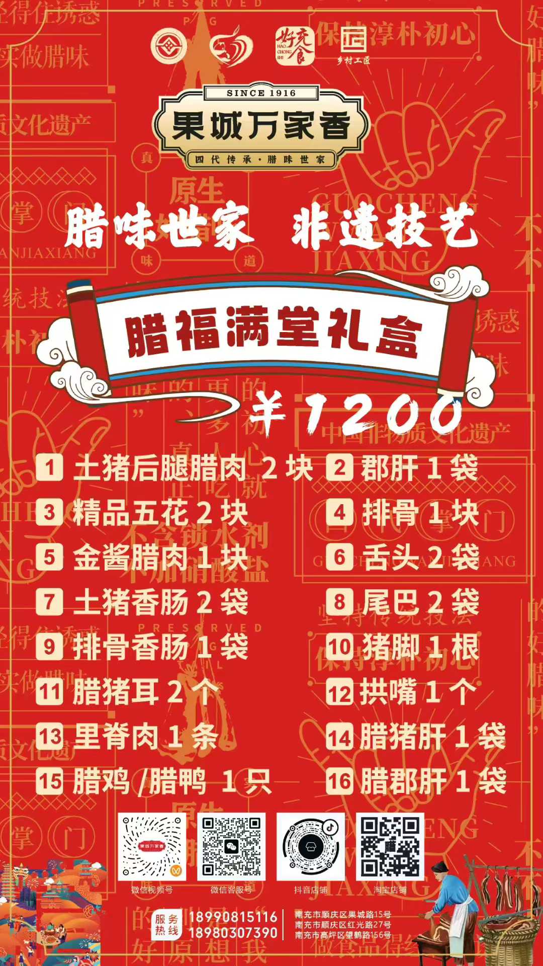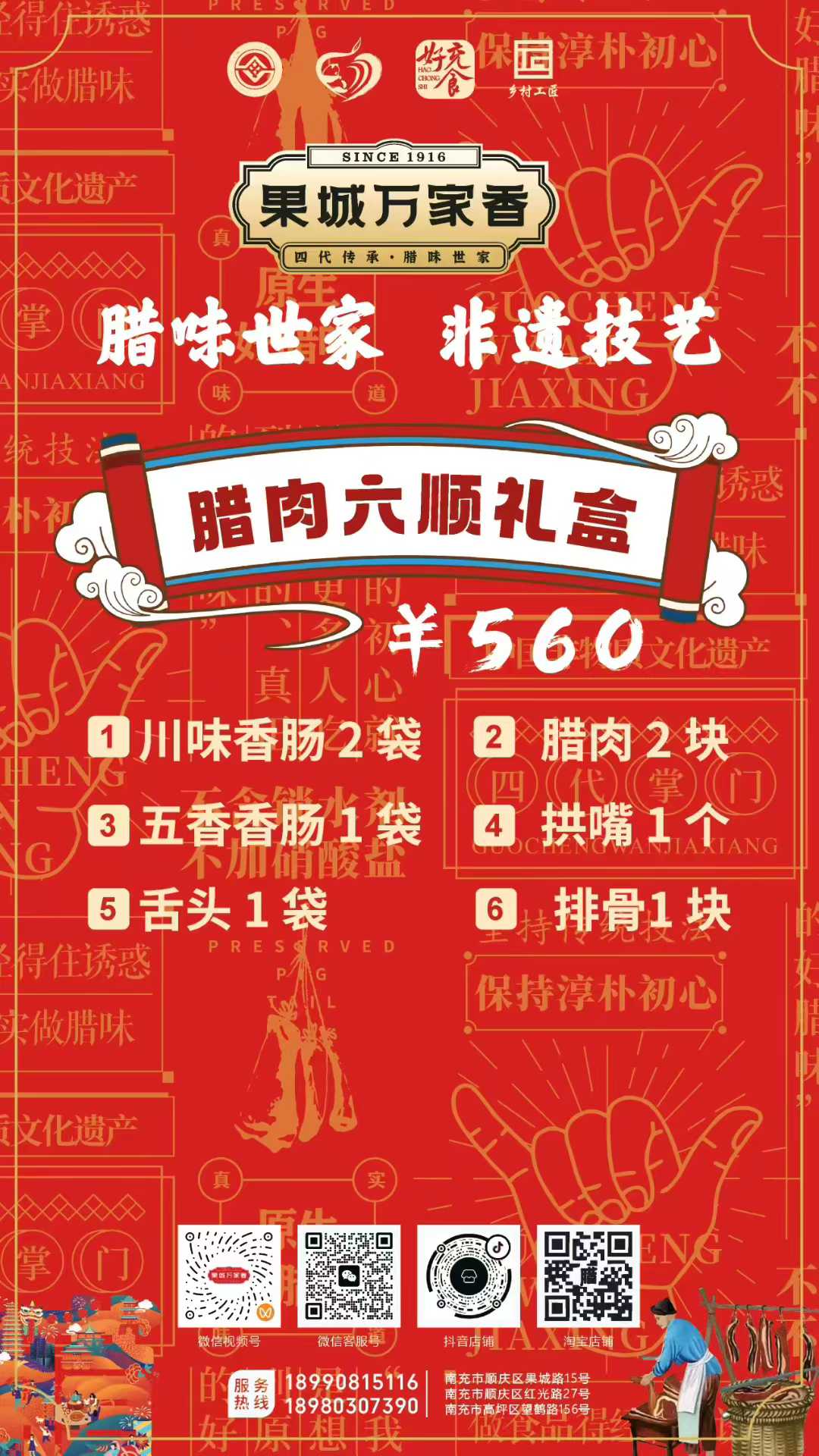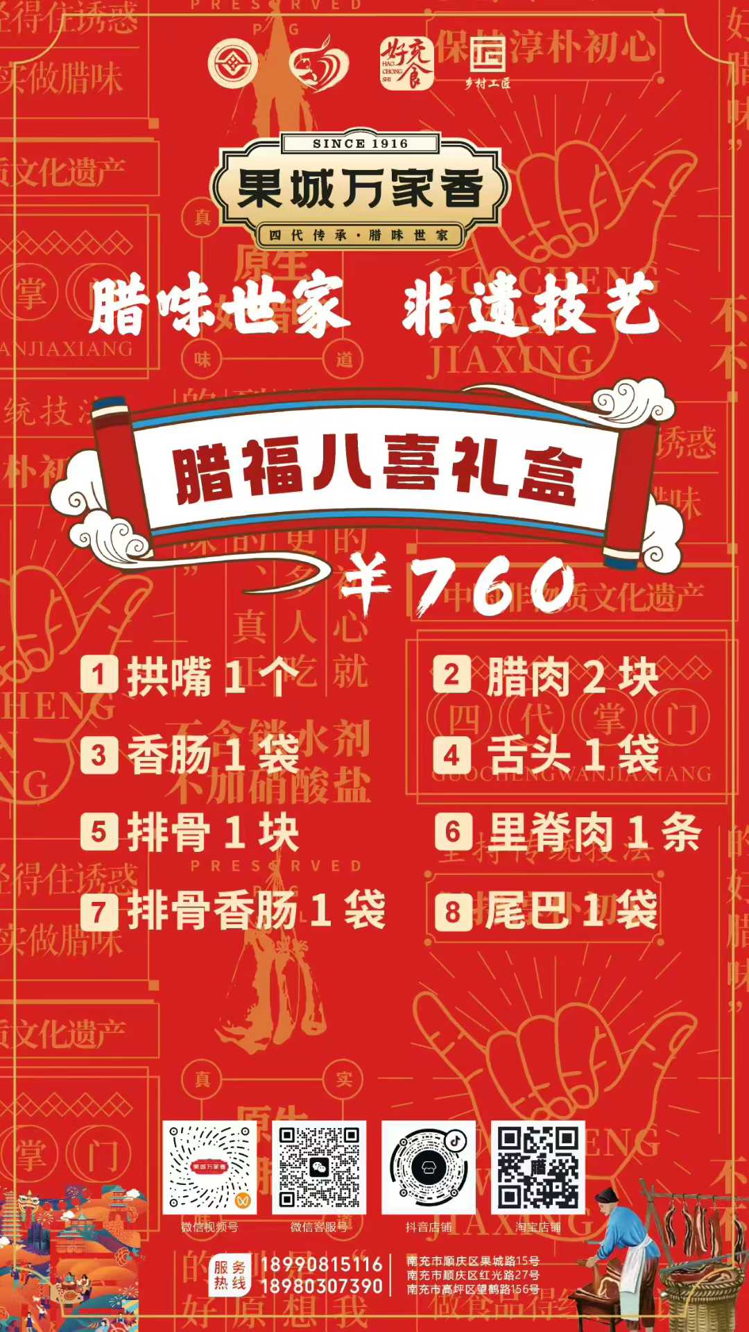 為滿足消費(fèi)者多樣化的節(jié)日需求,萬家香特別推出了臘福五福、臘肉六順、臘福八吉、臘福十全、臘福滿堂等多款禮盒,從380元到1200元不等,涵蓋臘肉、香腸、拱嘴、豬耳等十余種臘味單品,無論是家庭團(tuán)聚還是走親訪友,都能找到稱心之選。
